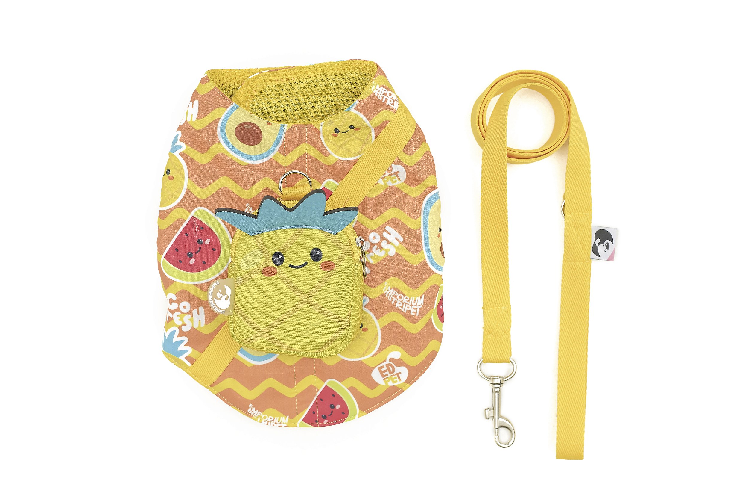 Desenvolvido com design diferenciado e materiais de alta qualidade que irão proporcionar um passeio tranquilo, seguro e com muito estilo! Modelo veste como roupinha e tem uma mochilinha nas costas para guardar itens pequenos, como saquinhos cata-caca. Na cor rosa a fruta da vez é o abacaxi.